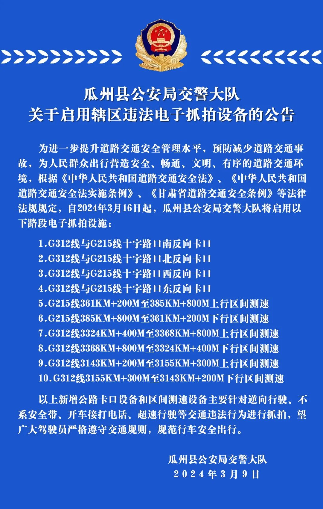 瓜州县交警大队启用辖区违法抓拍设备公告